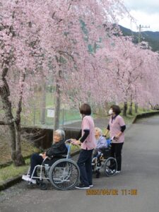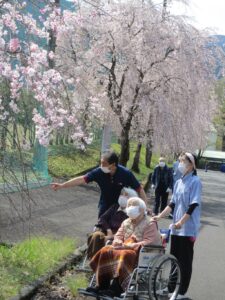 4月上旬、あかいしの郷周辺は桜色に染まり、ご利用者様がお花見を楽しみました 🌸🌸🌸